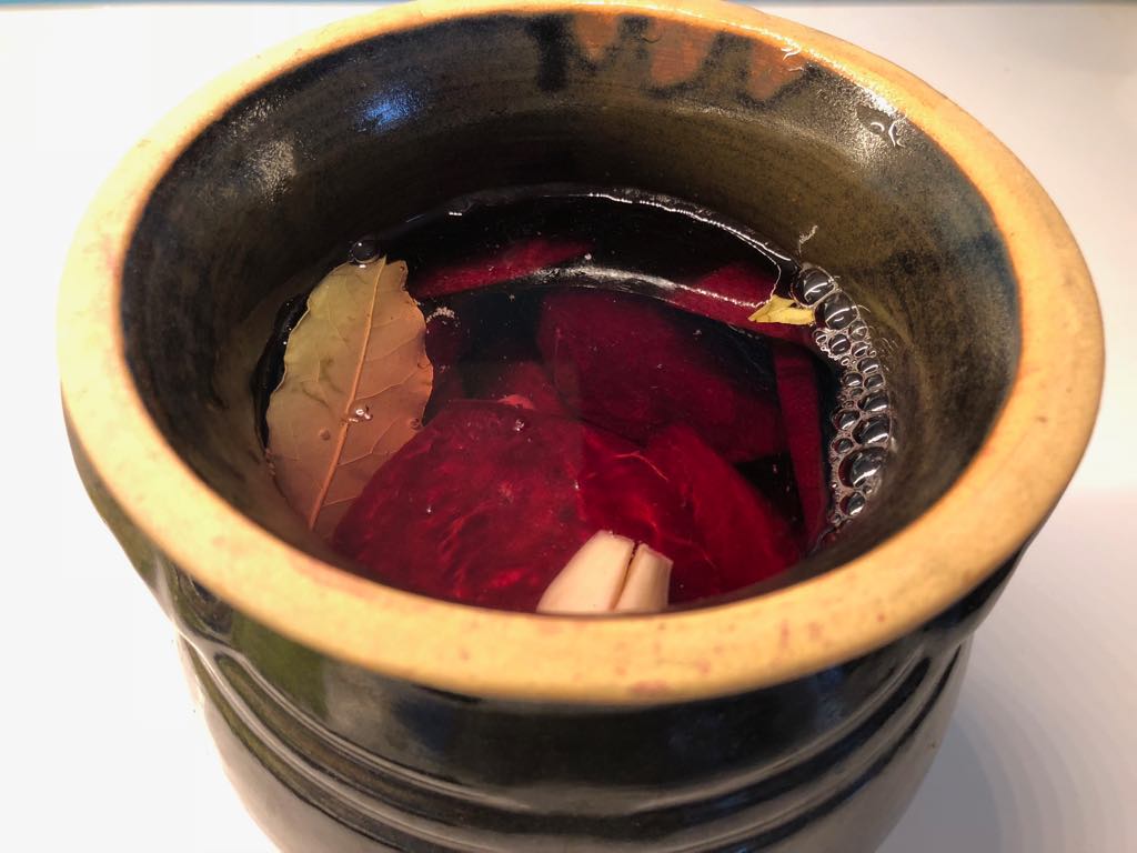 Buraki cieniutko obieramy, kroimy w grube plastry i układamy w naczyniu kamionkowym lub dużym wyparzonym słoju. Pomiędzy poszczególne warstwy wkładamy obrane i pokrojone na połówki ząbki czosnku, ziele i listki laurowe. Taka trochę zabawa w budowanie domku (buraki= cegiełki a przyprawy = zaprawa) 🙂