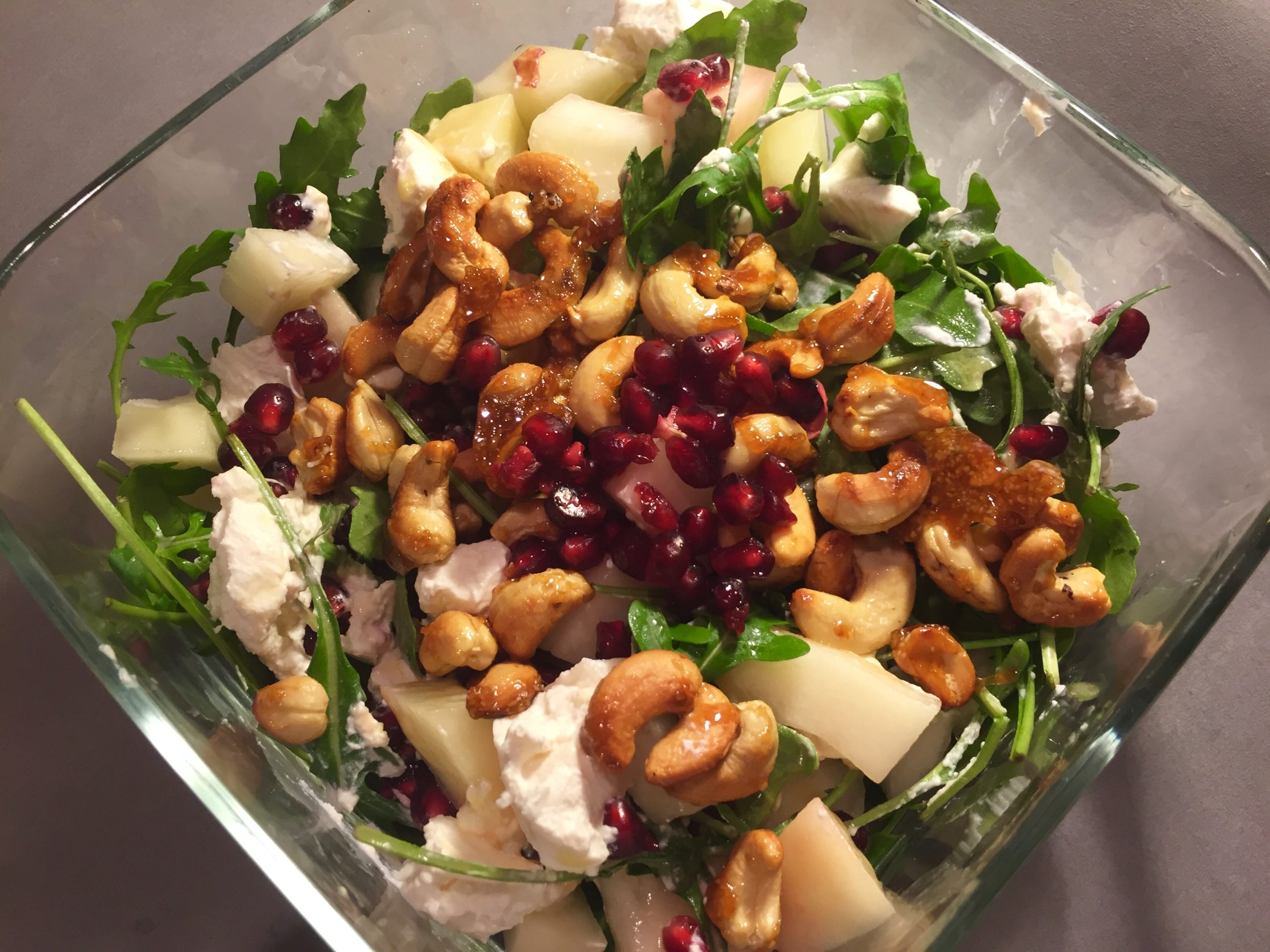 Sałatka z melonem, ricottą , granatem  i karmelizowanymi orzechami.